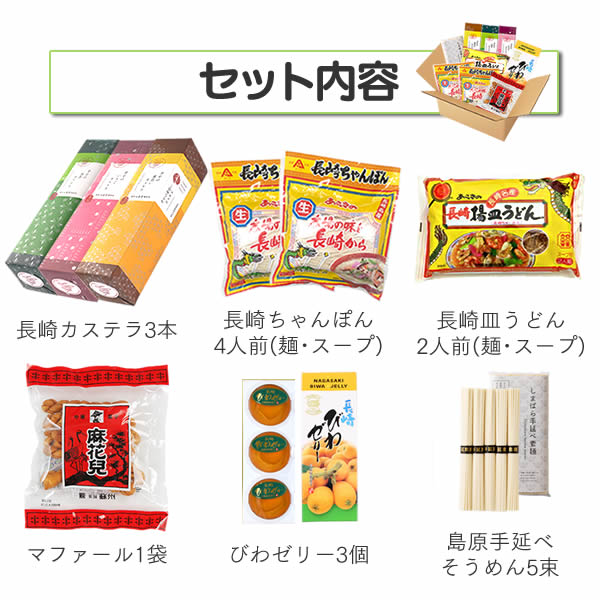 商品詳細 商品名 長崎復興支援 うまいもの福袋 内容 長崎カステラ0.6号(310g)×3 長崎ちゃんぽん2人前(めん100g×2袋・スープ28g×2袋)×2 長崎皿うどん2人前(めん50g×2袋・スープ21g×2袋) 長崎中華菓子マファール(150g) 長崎びわゼリー(130g)×3 島原手延べそうめん5束(250g) 原材料 [幸せの黄色いカステラ] 鶏卵(国産)、砂糖、小麦粉、水飴、ザラメ糖、蜂蜜、(一部に卵・小麦を含む) [いちごカステラ] 鶏卵(国産)、砂糖、小麦粉、水飴、ザラメ糖、蜂蜜、ストロベリー果汁、ブドウ糖果糖液糖/着色料(ラック)、酸味料、香料、(一部に卵・小麦を含む) [抹茶カステラ] 鶏卵(国産)、砂糖、小麦粉、水飴、ザラメ糖、蜂蜜、抹茶、クロレラ、(一部に卵・小麦を含む) [長崎ちゃんぽん] 【めん】小麦粉(国内製造)、食塩/酒精、ソルビット、かんすい(唐あく)、卵殻焼成カルシウム 【スープ】畜肉エキス(国内製造)、食塩、豚脂、しょうゆ、砂糖、香辛料、魚醤(魚介類)、オイスターエキス/調味料(アミノ酸等)、酒精、加工でんぷん、カラメル色素、酸味料、(一部に小麦・豚肉・大豆・魚醤(魚介類)を含む) [長崎皿うどん] 【油揚げめん】小麦粉、食用植物油脂/かんすい(唐アク水) 【スープ】でんぷん(国内製造)、砂糖、食塩、粉末しょうゆ、チキン風味調味料、ポーク風味調味料、香辛料、たん白加水分解物、なたね油/調味料(アミノ酸等)、酸味料、増粘剤(グァーガム)、カラメル色素、(一部に小麦・大豆・鶏肉・豚肉を含む) [長崎中華菓子マファール] 小麦粉(オーストラリア産)、砂糖、植物油、食塩/膨張剤(一部に小麦を含む) [長崎びわゼリー] びわ(長崎県産)、砂糖、ぶどう糖果糖液糖、洋酒、ゲル化剤(増粘多糖類)、トレハロース、酸味料、香料、酸化防止剤(ビタミンC)、パプリカ色素 [島原手延べそうめん] 小麦粉、食塩、綿実油 賞味期限 お届け予定日から10日以上(パッケージに記載) 保存方法 直射日光・高温多湿を避けて常温で保存して下さい 送料 送料無料・込み ※手提げ袋ご希望の場合は、購入時に必ず「手提げ袋必要」をご選択くださいクーポン利用で30%OFF ▼こちらをクリック▼ >>今すぐクーポンGET<<